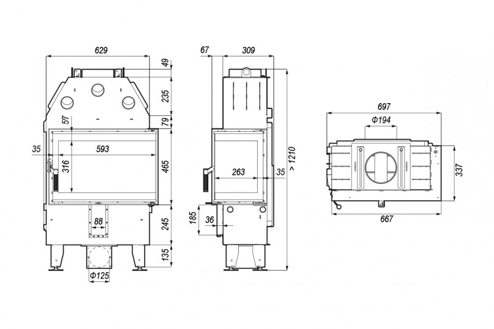 Для обеспечения более длительной эксплуатации и оптимизации мощности каминной вставки можно докупить боковые, задние или комплект тэрмоблоков. Также топка дополняется стальной декоративной рамкой, которая приобретается отдельно. Дополнительная опция: дверная ручка черного цвета.