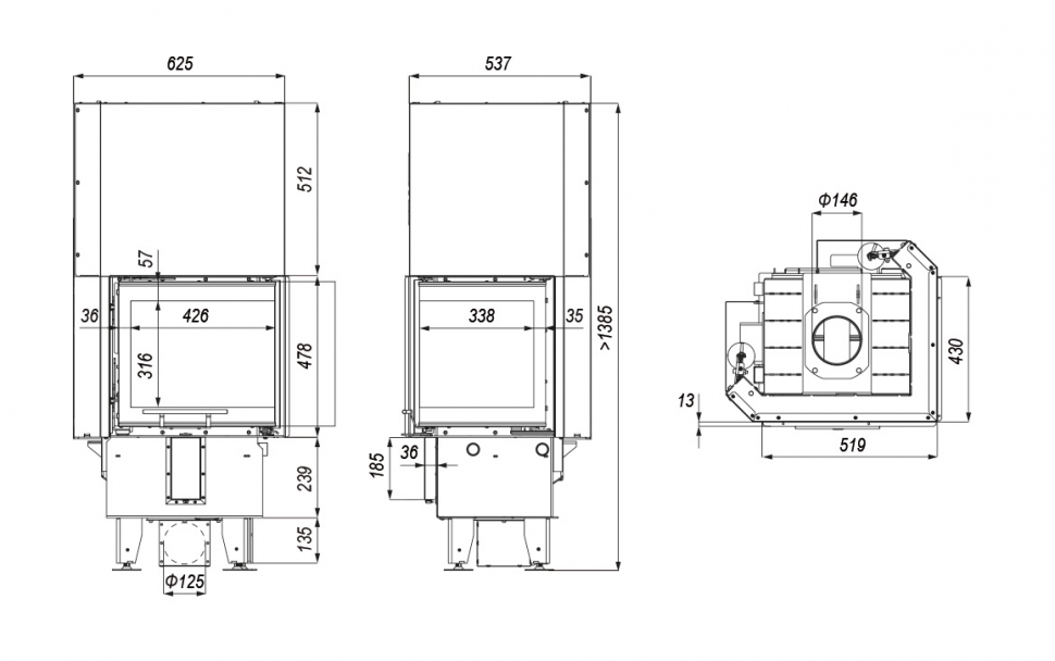 Угловая дверца со стеклом имеет большие размеры, открывается с помощью подъемного механизма и герметично закрывается. Благодаря системе вторичного дожига агрегат характеризуется длительным горением топлива на одной закладке.
