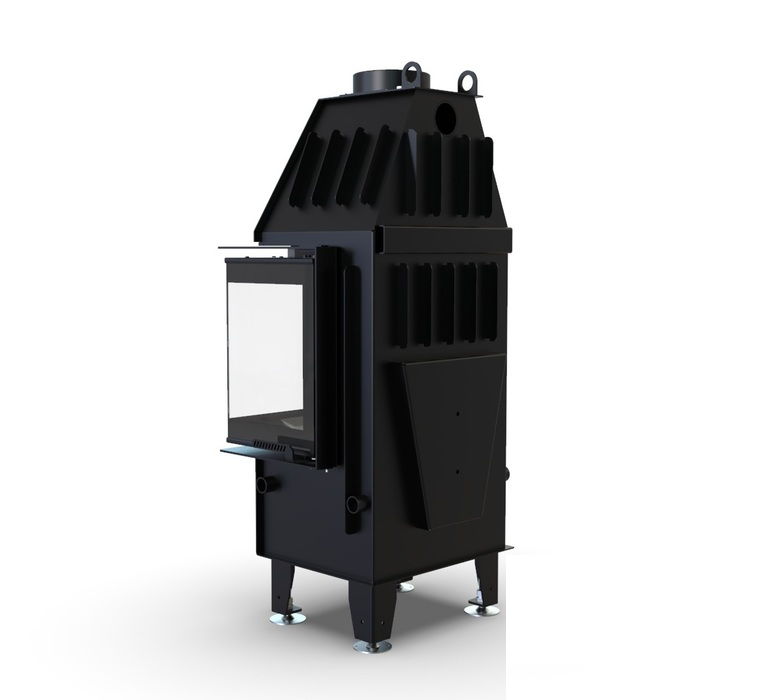 Имея небольшие габаритные размеры, демонстрирует хороший обзор огня при горении. П-образная дверца камина оснащена тремя составными жаростойкими стеклами, усилена в углах дополнительными пластинами жесткости и имеет только боковое открытие.