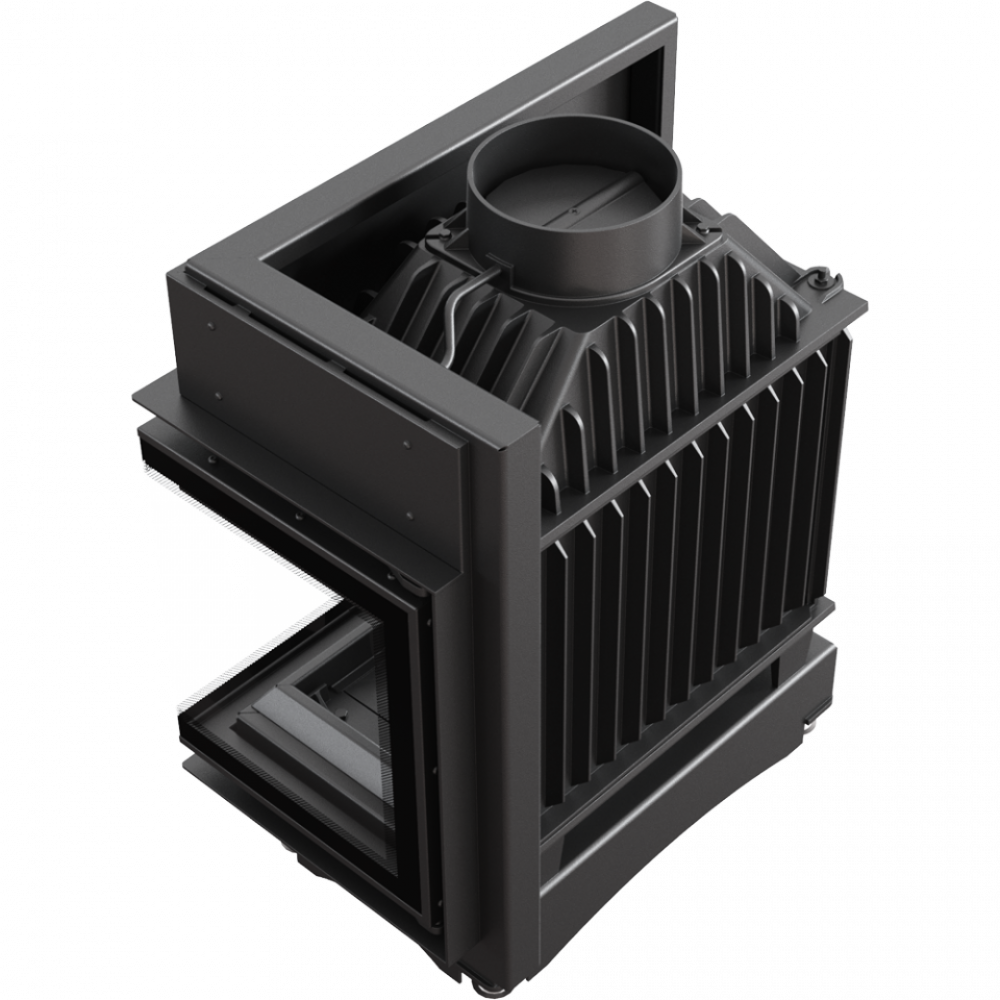 - Каминная топка с двумя стеклянными панелями, сопоставленными друг напротив друга под прямым углом (стеклянные панели соединены без рамы).