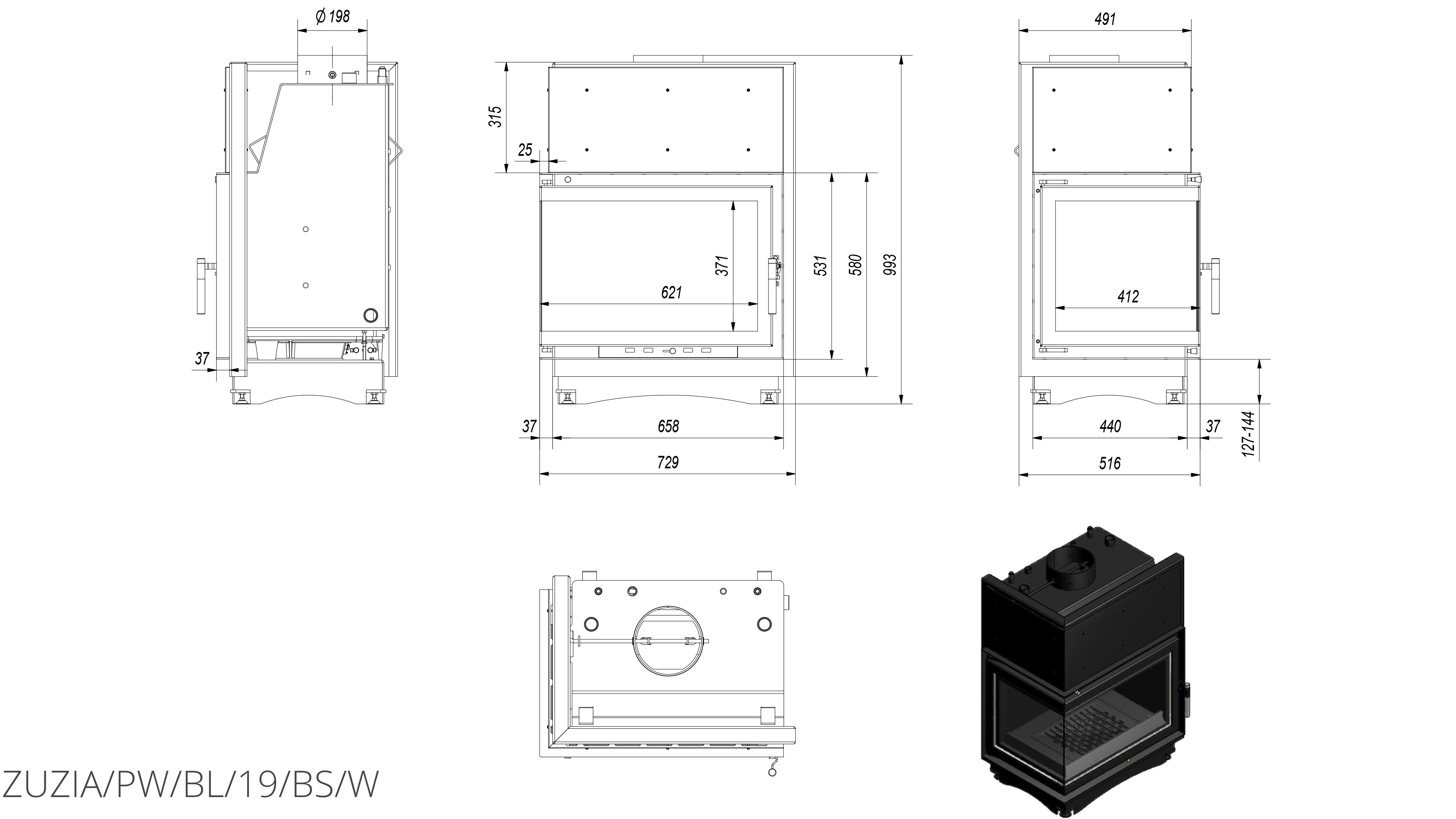 Каминная топка Kratki Zuzia/PW/BL/19/BS/W
