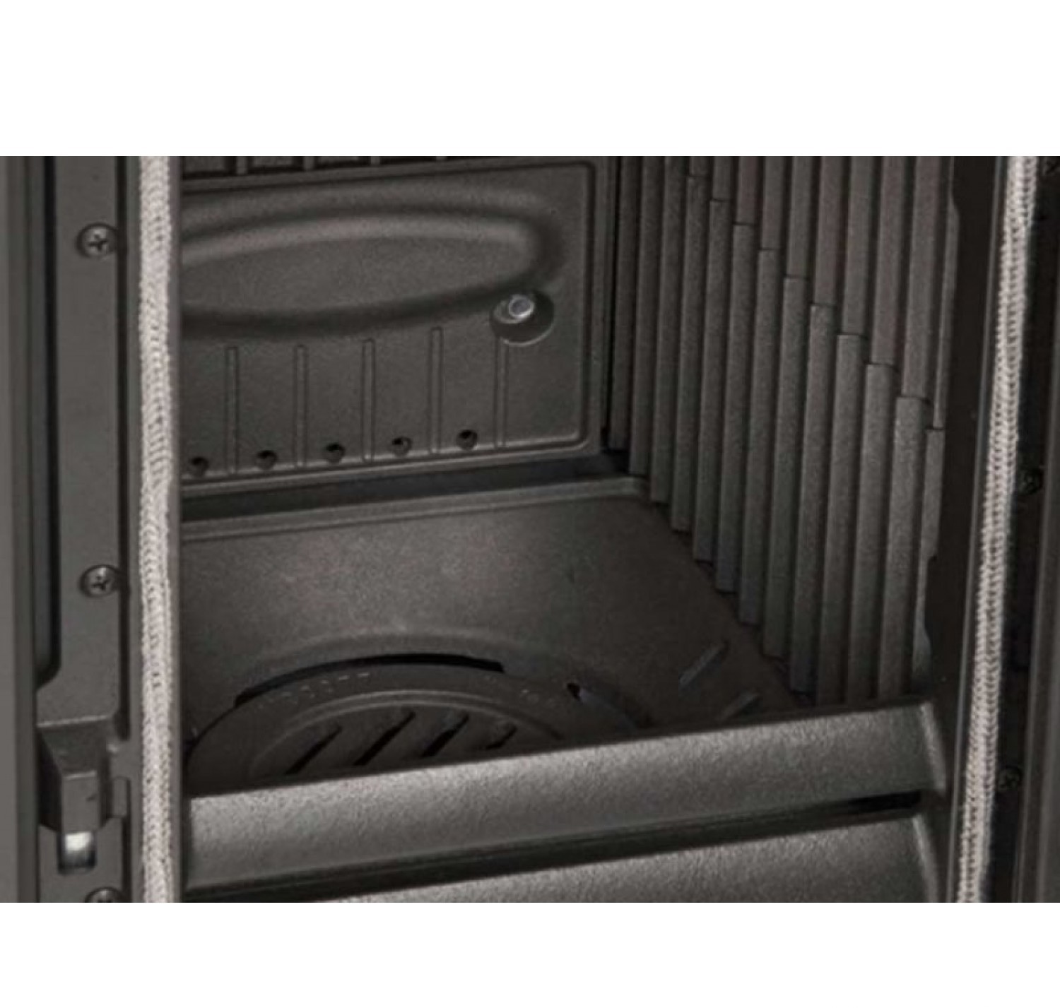 Дверца печи открывается в сторону. Большое керамическое стекло дверцы  выдерживает температуру до 750?С. Система «чистое стекло» позволяет беспрепятственно любоваться видом огня. Также печь обладает механизмом бесшумного подъема дверцы.