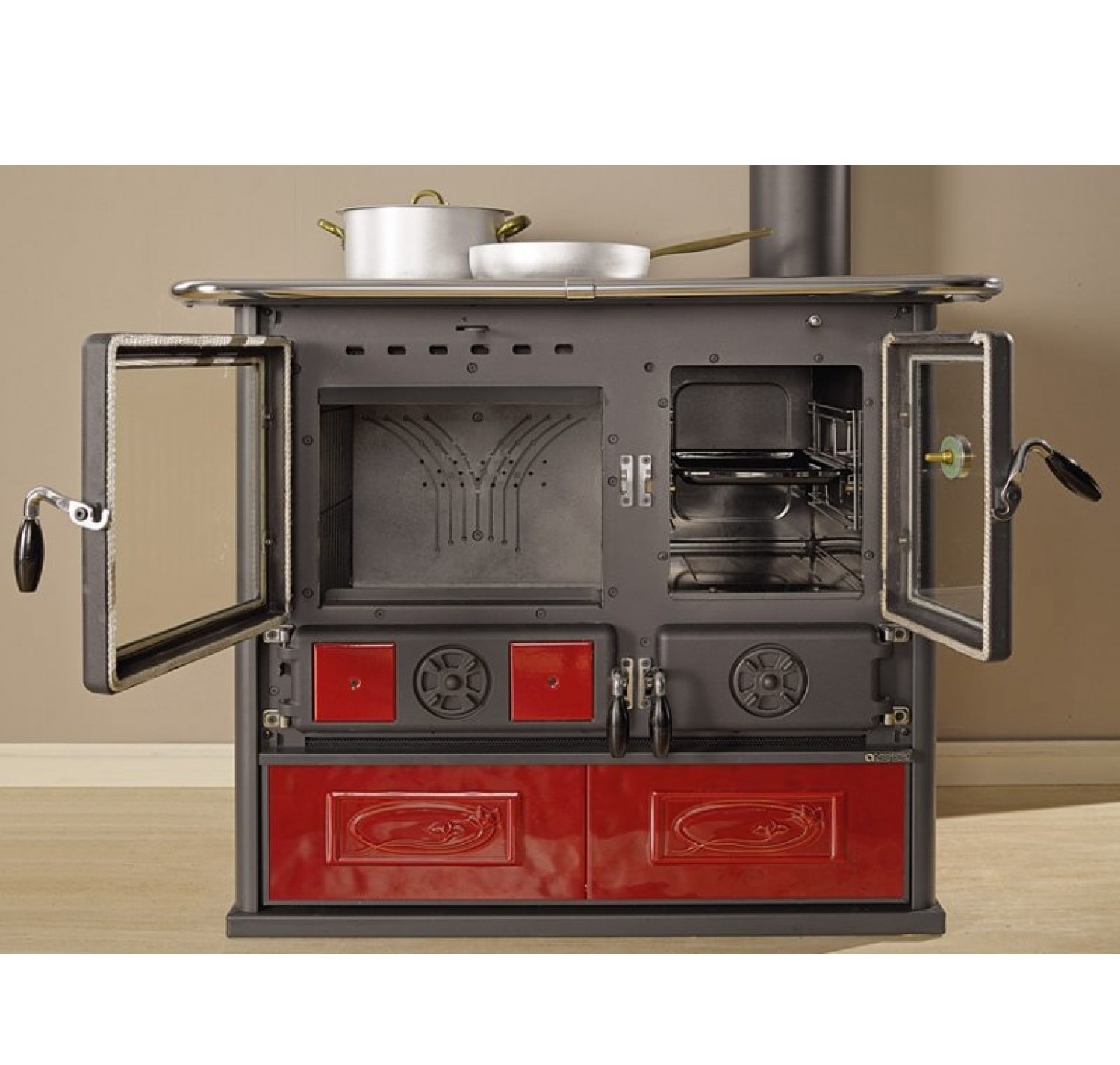 Она сочетает в себе три основных компонента, которые не только способны обеспечивать Ваш дом быстрым и качественным обогревом, но и сделать жизнь намного проще. Печь-камин La Nordica-Extraflame Rosa Reverse оснащена вместительным духовым шкафом и поверхностью для варки. Изготовлена печь камин из литого чугуна высокого класса, который, как известно, обладает отличной теплоотдачей, благодаря чему помещение нагревается быстрее. А за счет прочности чугуна, печь прослужит более длительное время. Духовой шкаф печи-камина Rosa Reverse покрыт специальной термоустойчивой эмалью.