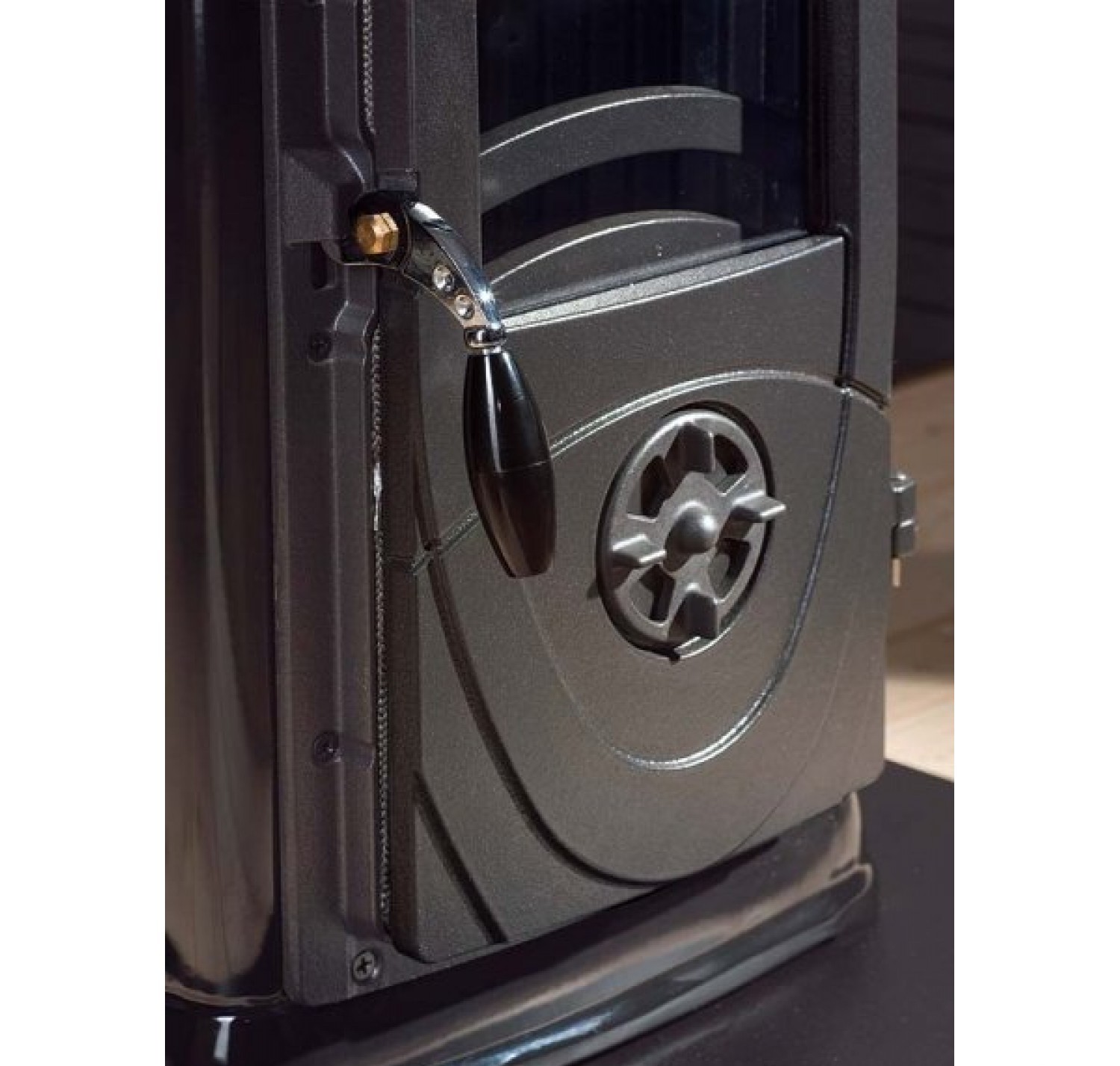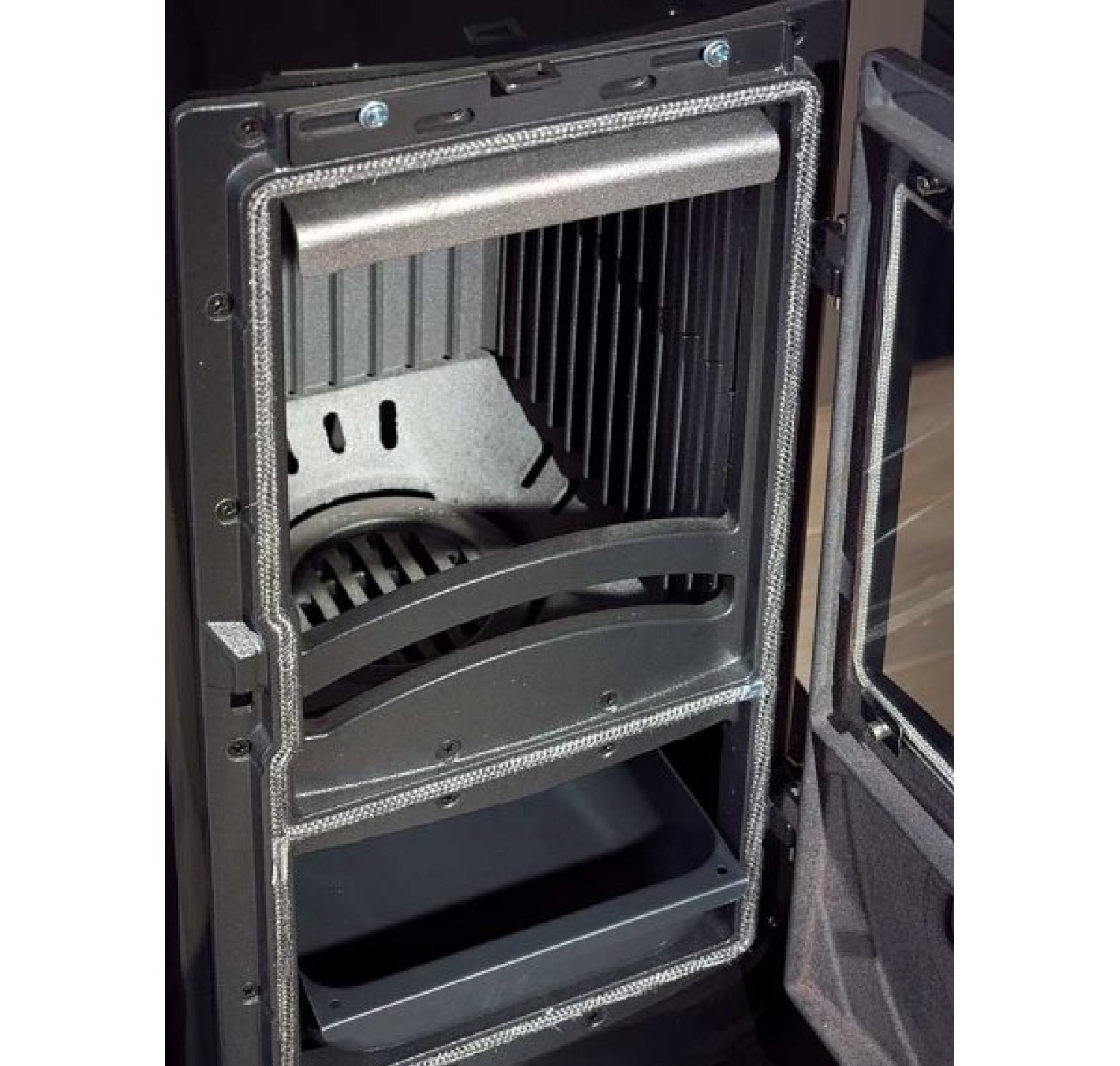• Панорамная дверь, которая позволяет легко загружать топливо и наслаждаться игрой живого пламени.