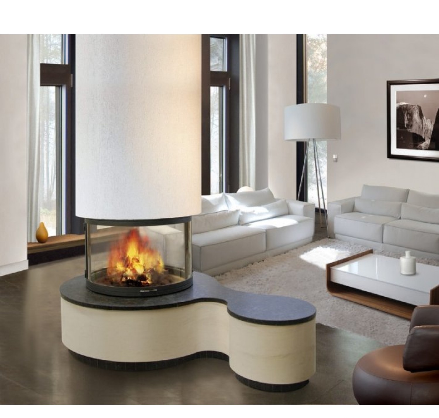 Топка предназначена для установки только в центре комнаты, оснащена подъемным механизмом, с помощью него все стекла поднимаются вверх. Две противоположных стекла открываются вбок для удобства чистки камина. Корпус топки выполнен из легированной стали. Для установки топки необходимо дополнительно заказывать систему подвешивания. В зависимости от ситуации установки необходимо выбрать подходящий вариант подвешивания топки исходя из высоты помещения и верхней фиксации крепления. Очаговая зона основания выложена высокопрочным огнеупорным кирпичом.