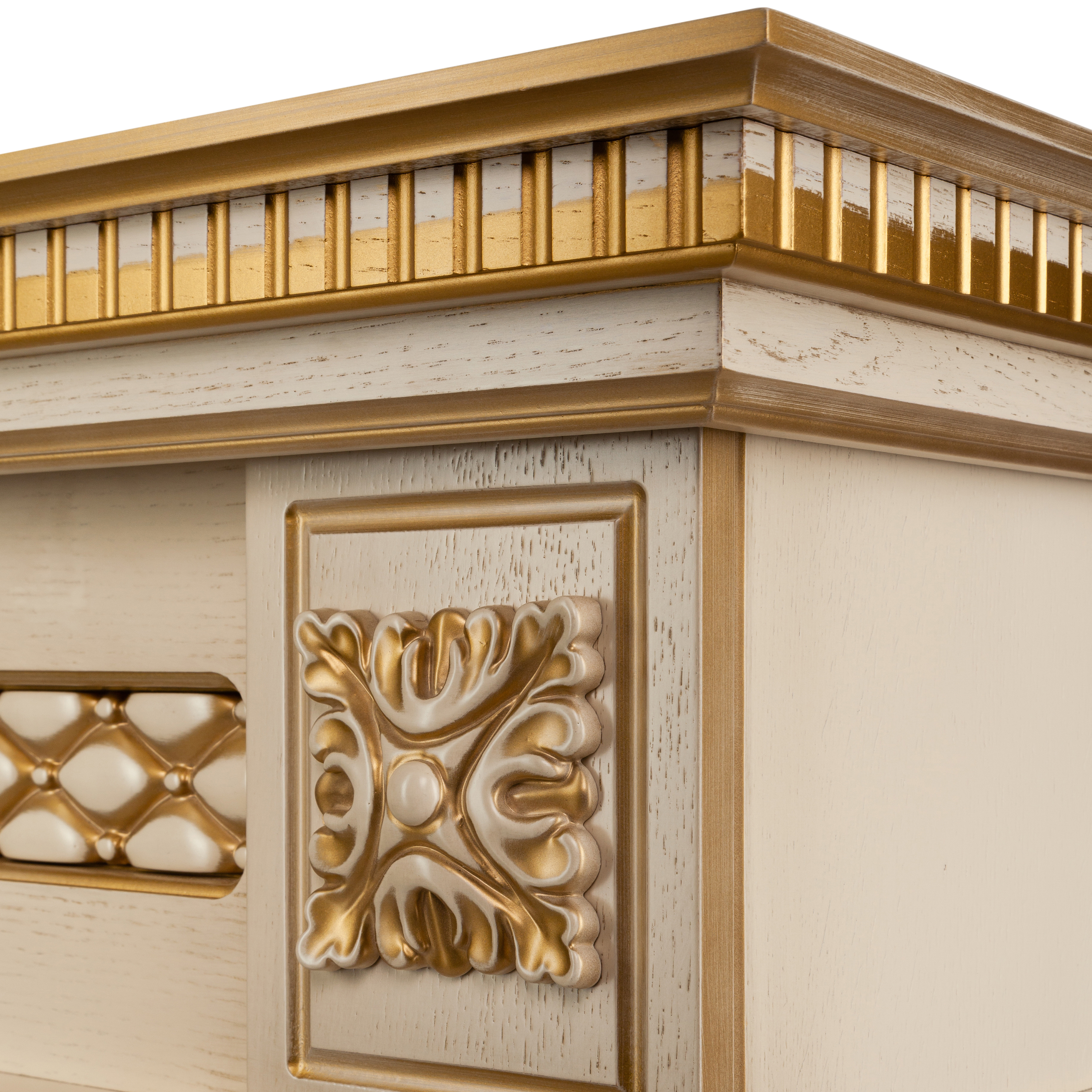 Портал каминокомплекта выполнен в классическом стиле и отличается сдержанным декором. Боковые панели оформлены в форме своеобразных прямоугольных колонн, верхняя часть которых резными изогнутыми консолями. Верхняя панель над очагом украшена изящным узором, центральным элементом которого является античная амфора. По бокам панели расположены квадратные вставки с розетками. На поверхности колонн и панели имеются вставки из цветного мрамора. Сверху портал венчает мощная каминная крышка, по кромке которой протянут геометрический узор. Устойчивость конструкции обеспечивает основание, на которое установлен портал.