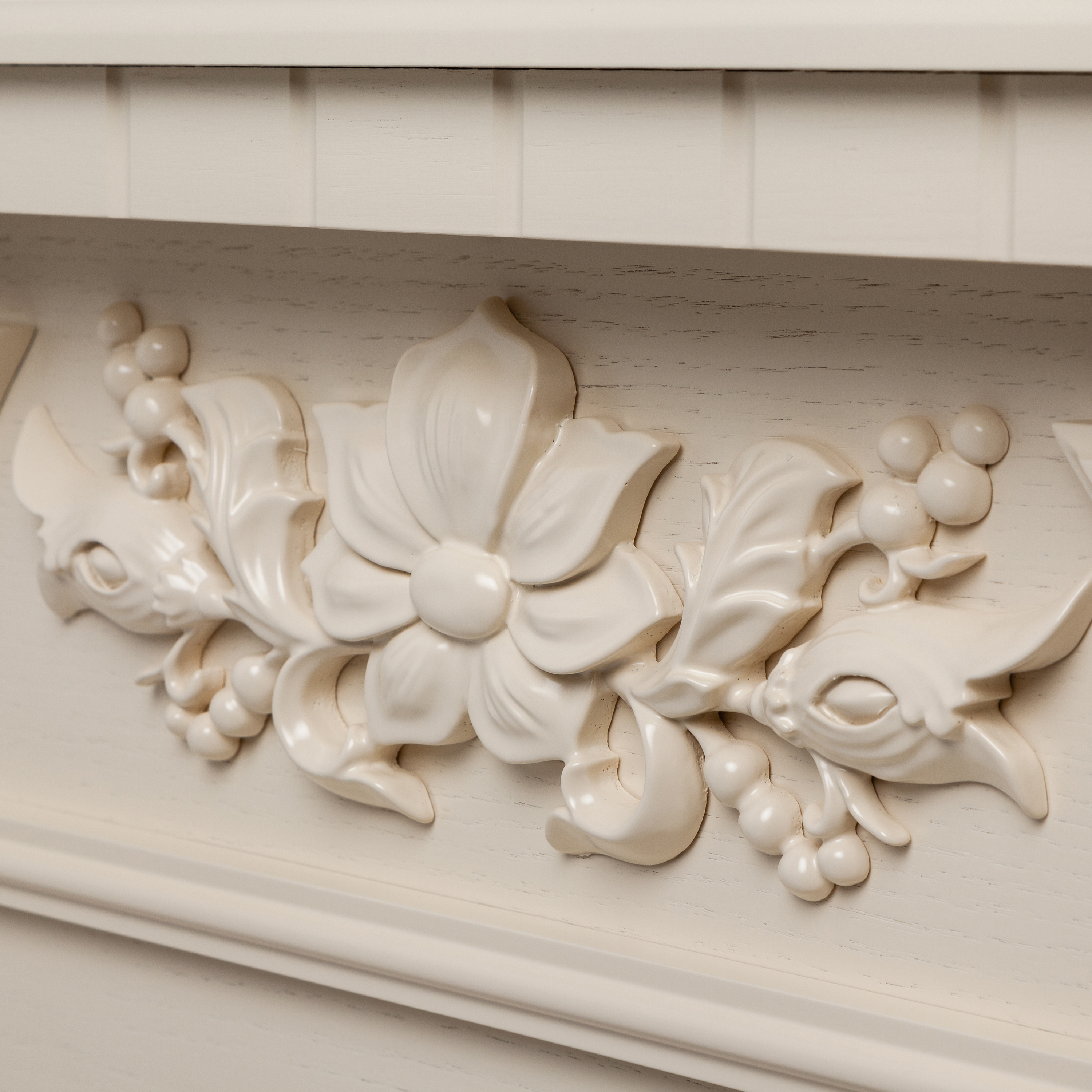 - Портал камина изготовлен из МДФ и покрыт натуральным шпоном беленого дуба. По бокам лицевой части портала установлены две античные полуколонны, на которые опирается каминная полка, украшенная по карнизу геометрической резьбой. На верхней панели, под каминной полкой, установлен классический травяной орнамент и фигурные тяги.