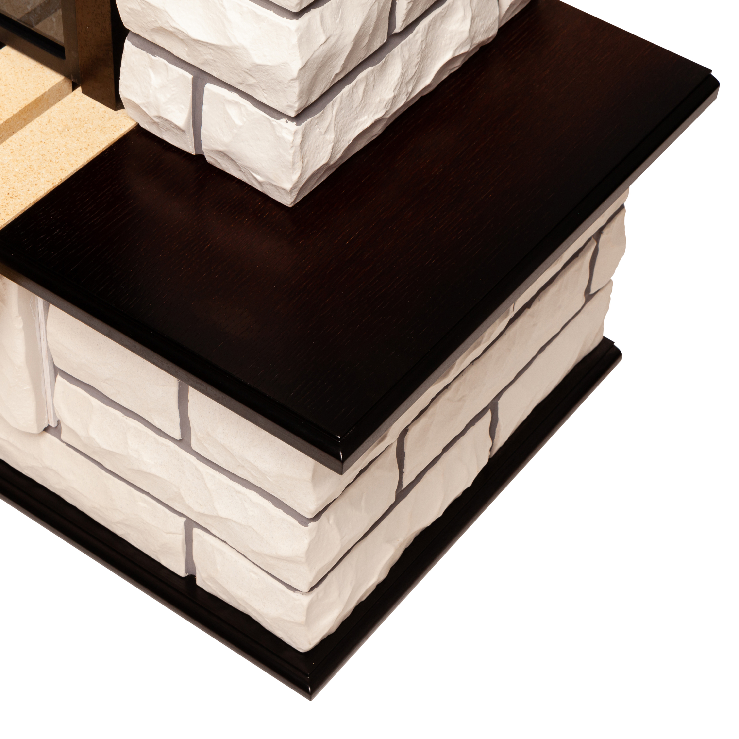 - Изготовлен из искусственного камня и МДФ, покрытого шпоном, - прочного, надежного и стойкого к любым внешним воздействиям материала. Сочетание светлого камня и темного дерева, декоративная фрезеровка. Дизайн дополнен выемкой для хранения дров в основании обрамления. С массивной каминной полкой.