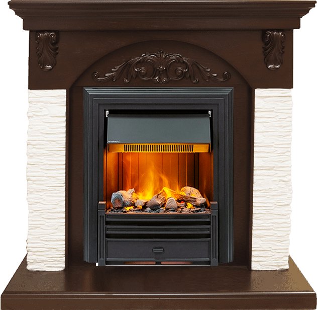 Каминокомплекта Dimplex Bern выполнен в классическом стиле. Он изготовлен из дерева и искусственного камня и представлен в нескольких цветовых решениях. Фронтальная часть портала украшена резным орнаментом, который придает нотки античности. Колонны выполнены из камня, столешница и постамент – из дерева. Зона очага визуально выделена деревянным обрамлением контрастного цвета.