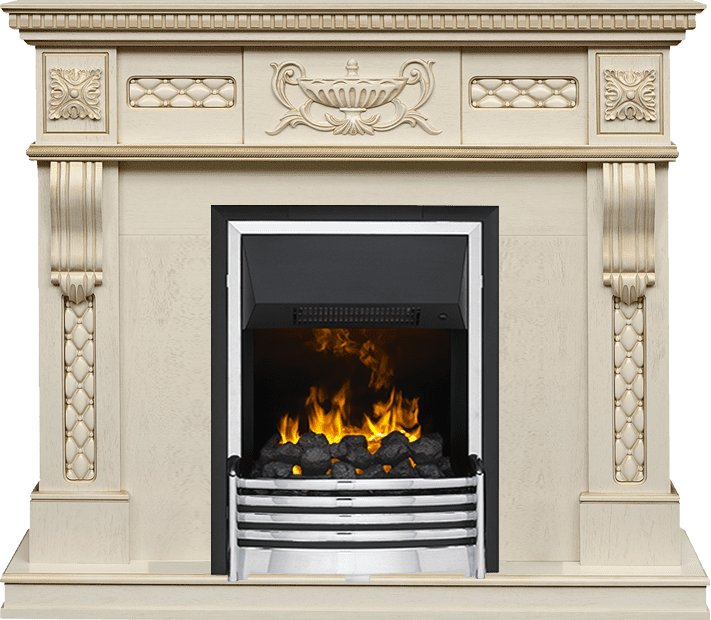 Боковые части портала и фронтон каминокомплекта Dimplex Corsica украшены изящным золотым орнаментом. По центру фронтона расположена лепнина в виде античной амфоры. Кронштейны украшены декоративным узором.