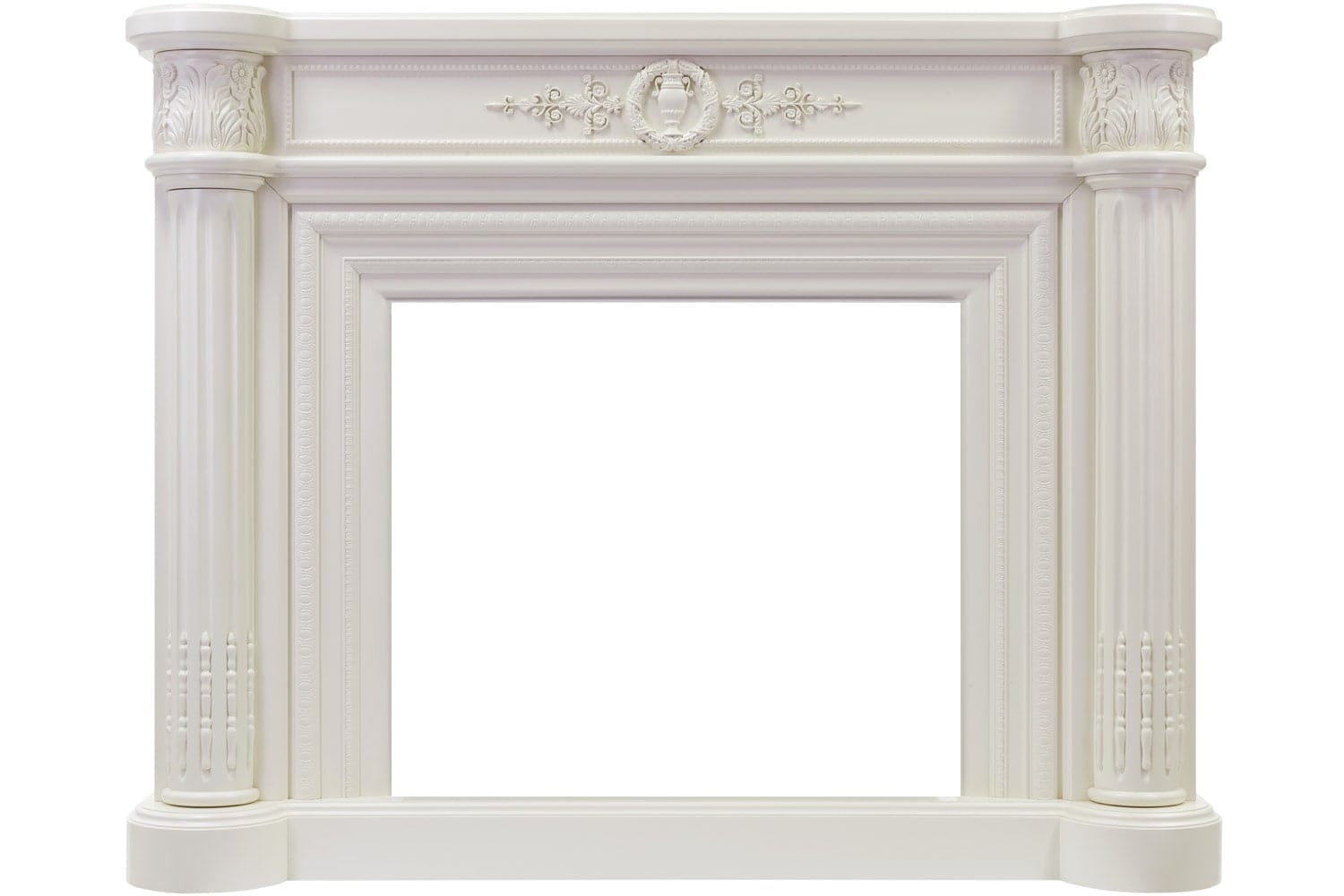 Обрамление для камина сделано из высококачественных материалов. Резной декор украшает фронтальную поверхность портала, а зона очага обрамляется изящными колоннами.