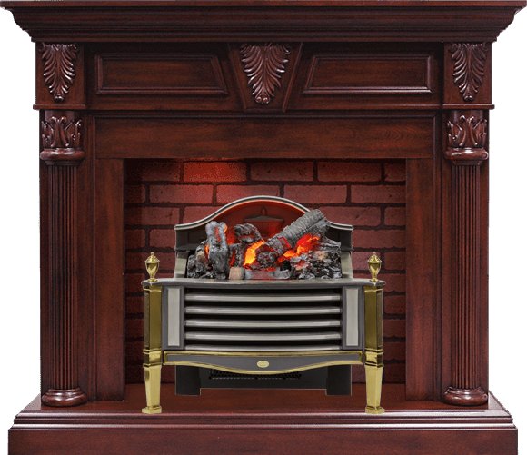 Сам очаг отличается изяществом дизайна - точеные позолоченные ножки поддерживают колосник насыщенного черного цвета, в котором расположены поленья со встроенными светодиодами, что делает их неотличимыми от натурального тлеющего в костре дерева. На задней стенке очага размещены фигурные флористические элементы, которые гармонично сочетаются с общим стилевым решением камина.