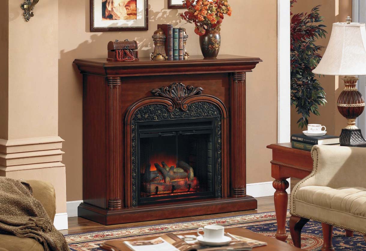 - Изящная резная отделка и панель под металл вокруг очага. Колонны делают обрамление более привлекательным. По центру портала красивый растительный узор.