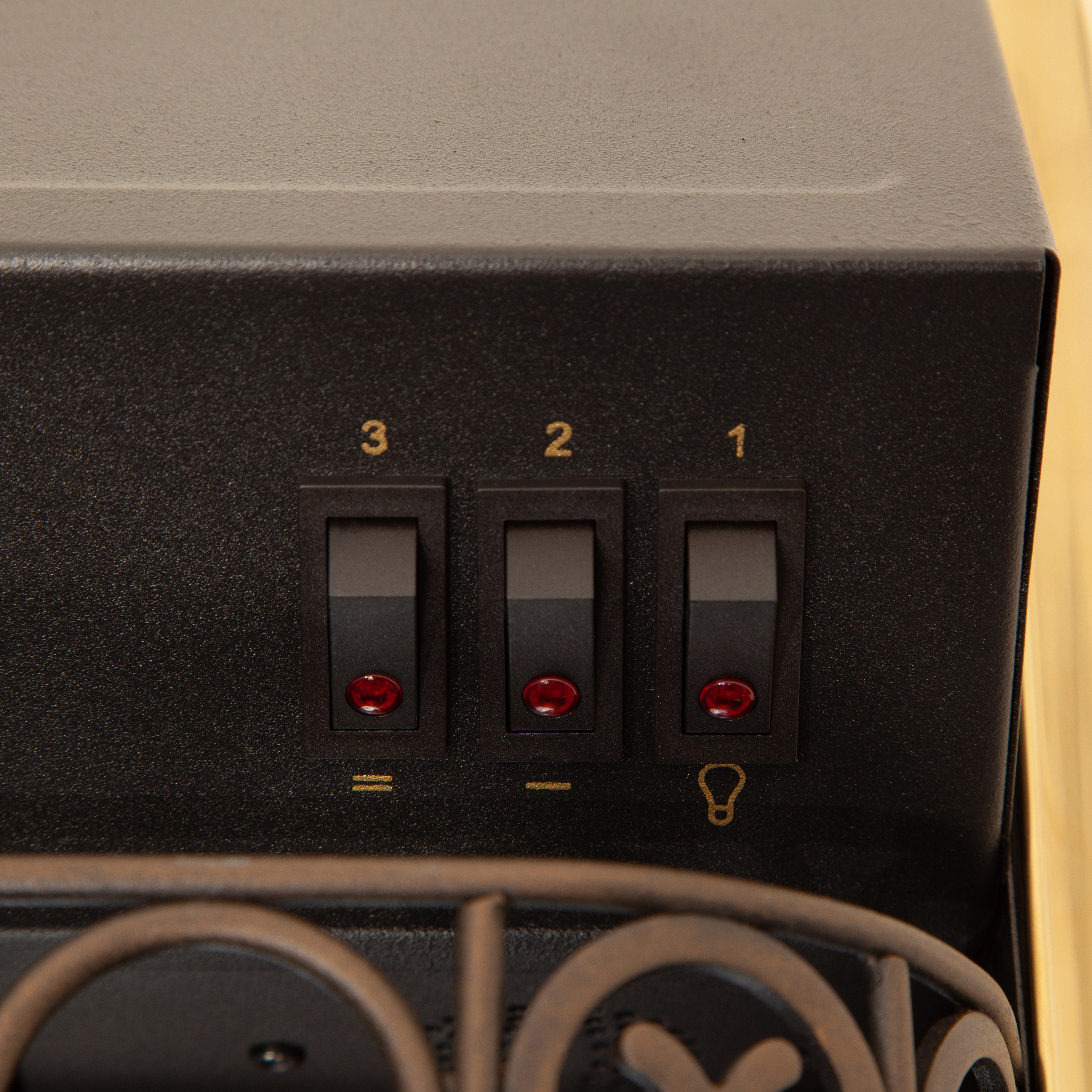 Переключатель позволяет включать на полную (1 500 Вт) или половинную (750 Вт) мощность. В режиме визуализации пламени потребление электроэнергии составляет 80 Вт (две свечеобразные лампы E14 мощностью 40W).
