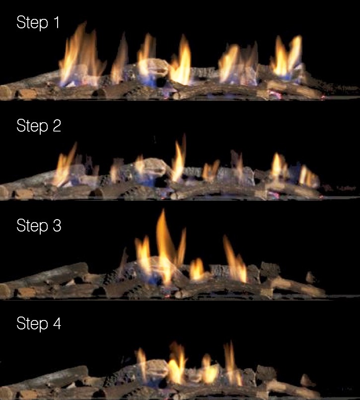 • Step 3. Как и в первом режиме, огонь в горелке горит на полную мощность, но сконцентрирован в средней части камина.