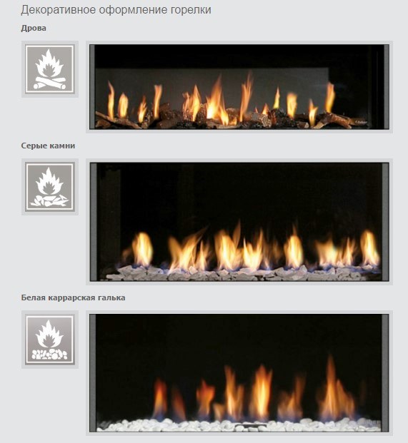 Они смотрятся в топке очень гармонично и надежно скрывают от глаз наблюдателей горелку. Выполнены они из материалов, в составе которых отсутствуют горючие волокна, что способствует повышению практичности изделия. ведь при работе топки на ее внутренних поверхностях не оседает копоть и сажа, что позволяет им больше оставаться чистыми. В сравнении с настоящими дровяными каминами это является явным преимуществом.