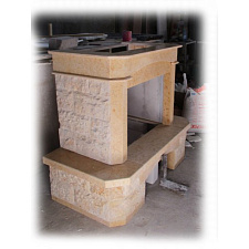 Облицовка из натурального камня. Полированные элементы - мрамор Rosso Verona, колотые элементы - кремово-желтый песчаник. Балка из дуба. Вариант прямой и угловой. Подходящие топки 700 серии с прямым стеклом.