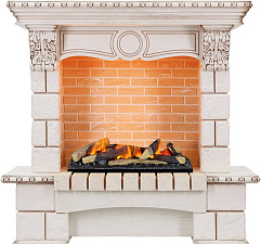 Фронтальный камин под дровяную топку с прямым стеклом. Облицовка выполнена в классическом стиле, декорирована резными колоннами.