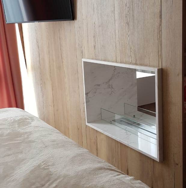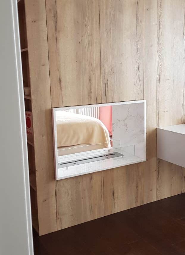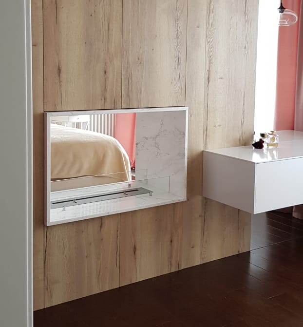 Сквозной биокамин  из мрамора был установлен между спальней  и гостиной в квартире в центре Москвы.